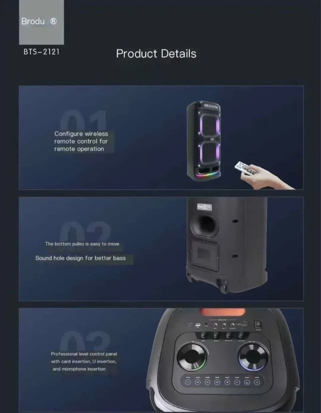 بلندگو BTS-2121، یک استودیوی موسیقی و مرکز سرگرمی کامل را به هر مکانی میآورد. این دستگاه قدرتمند و پرامکانات، همراه ایدهآلی برای مهمانیهای پرانرژی، گردهماییهای دوستانه و اجراهای کراکه حرفهای است.