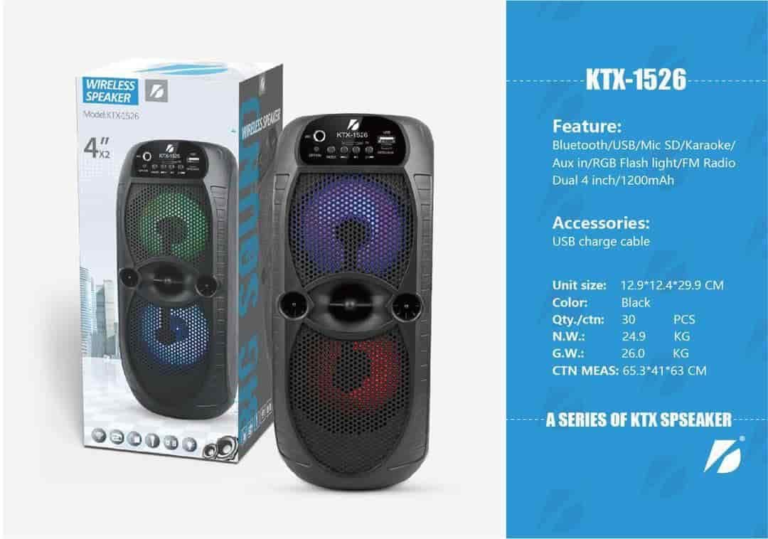 اسپیکر KTX-1526 یک مدل جمعوجور و کاربردی از اسپیکرهای قابل حمل است که با طراحی مناسب، امکانات کامل و صدای شفاف، انتخابی عالی برای استفاده روزمره، مهمانیهای کوچک و فضای باز محسوب میشود.