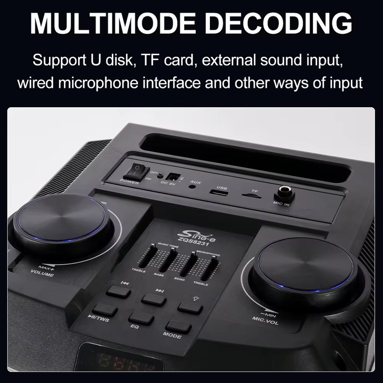 اسپیکر ZQS-8231 با طراحی مدرن، توان صوتی بالا و امکانات کامل، گزینهای عالی برای پخش موسیقی در جمعهای دوستانه، فضای باز و جشنها است